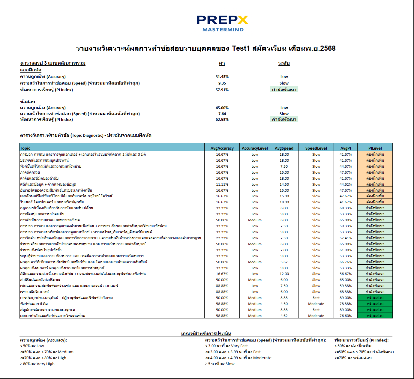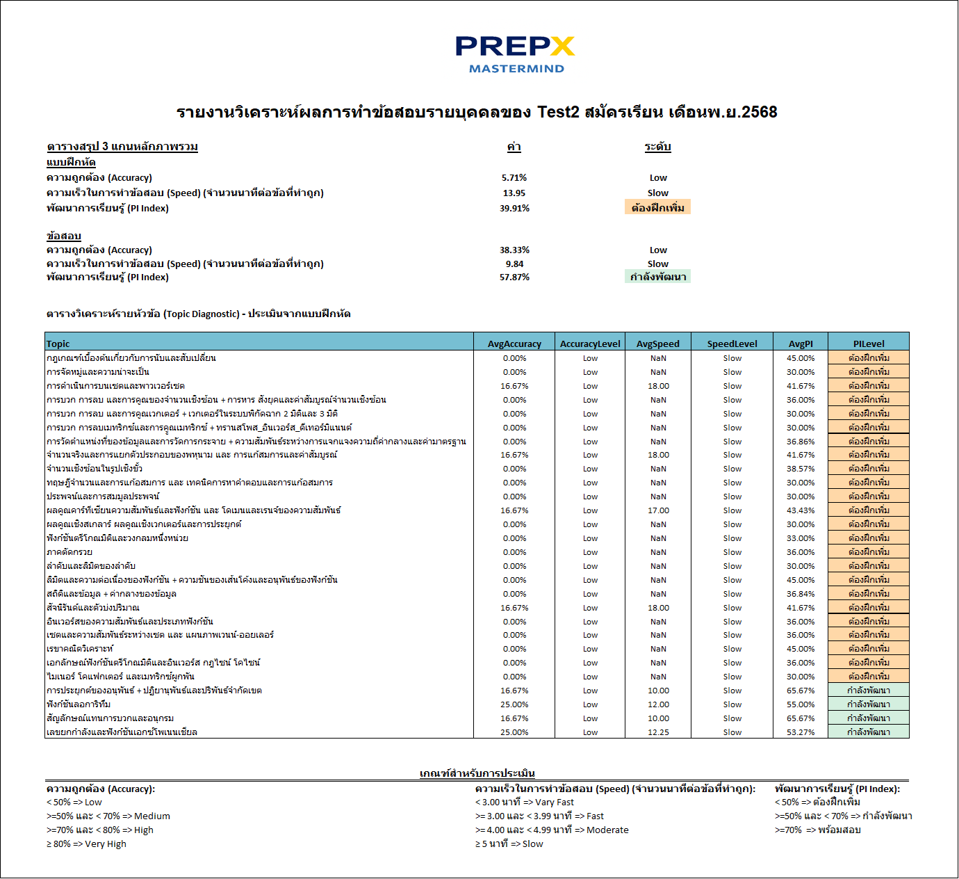 ตัวอย่างวิเคราะห์การทำข้อสอบรายบุคคล : “นักเรียนจะมองเห็นจุดแข็ง–จุดอ่อนของตัวเองอย่างชัดเจน พร้อมเร่งพัฒนาเฉพาะหัวข้อที่จำเป็น ทำให้การเตรียมสอบแม่นขึ้น เร็วขึ้น และมั่นใจมากขึ้นก่อนวันจริง”